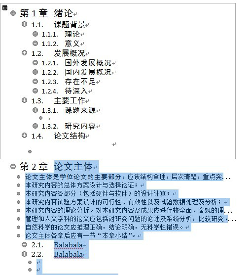 同理,我們在節(jié)標題(標題2)等,也如此設置。于是得到一個結構明了的文檔框架了。